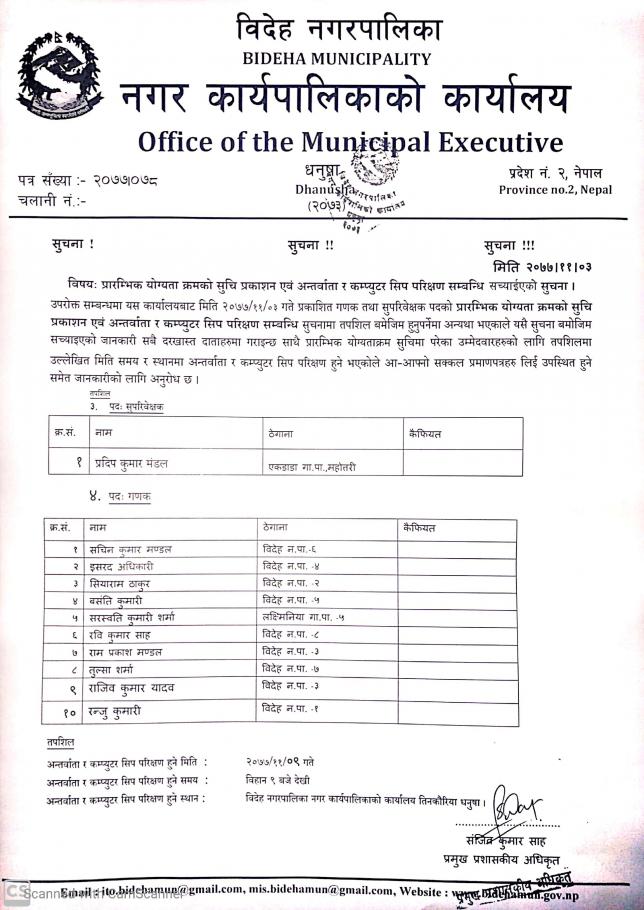 » प्रारम्भिक याेग्यता क्रमकाे सुचि प्रकाशन एवं अन्तर्वाता र कम्प्युटर सीप परिक्षण सम्बन्धि सूचना सच्याईएकाे वारे ।