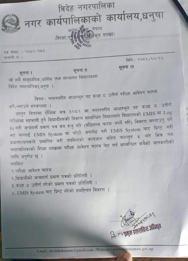 सबै सामुदायिक, धार्मिक तथा संस्थागत विद्यालयहरु कक्षा ८ को परीक्षा फारम पेश गर्ने सम्बन्धमा ।
