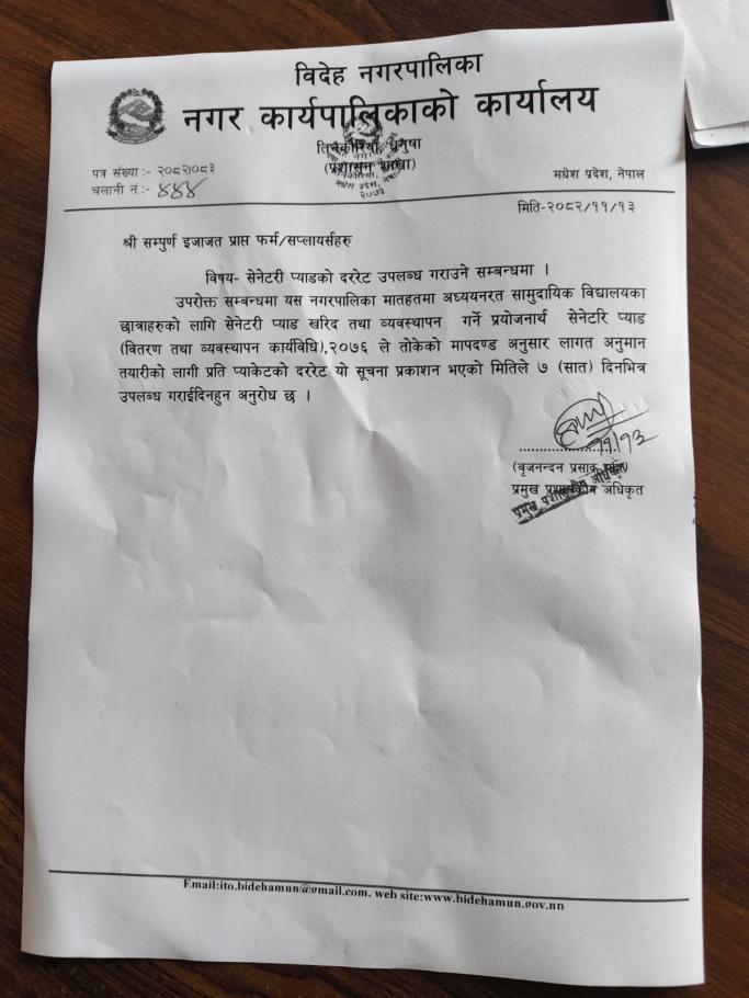 सेनेटरी प्याडको दररेट उपलब्ध गराउने सम्बन्धि सूचना ।